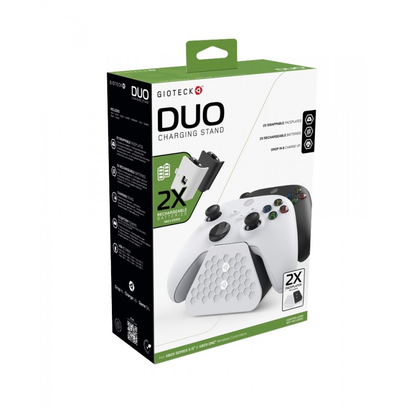 Uzlādējiet un parādiet savus Xbox bezvadu kontrolierus, izmantojot GIOTECK DUO uzlādes statīvu. Katrā uzlādes statīvā ir iekļauti 2 uzlādējami akumulatoru komplekti, kas nodrošinās jums vairākas stundas spēlēšanas un samazina rezerves bateriju izmaksas. Jūs varat ne tikai uzlādēt divus kontrolierus vienlaikus, bet arī iekļautās maināmās priekšējās plāksnes nodrošina tūlītēju pielāgošanu, lai tās atbilstu jūsu Xbox iestatījumiem, un lai tas iegūtu pievilcīgu displeju.